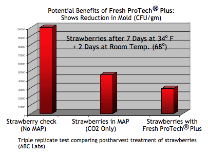 The check samples had more than three times the mold growth (cfu) as strawberries in Fresh ProTech® Plus MAP after 7 days at 34° and 2 days at room temperature (68°F), based on a triple replicate study.